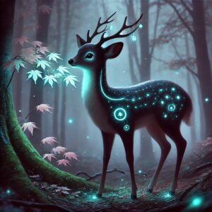 A juvenile Star Fawn—rarely seen outside deep woodland sanctuaries. Said to be celestial-touched, its glowing glyphs pulse in rhythm with the seasons and the stars.