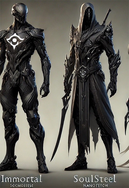 Side-by-side comparison of an Immortal Operative (left) and a fully armored Zylvan Knight of the Soulsteel Order (right). While both are equipped with adaptive nanoshell exo-armor, only Zylvan Knights carry the ceremonial Soulsteel, a symbiotic alloy believed to resonate with the wielder’s own echo signature.