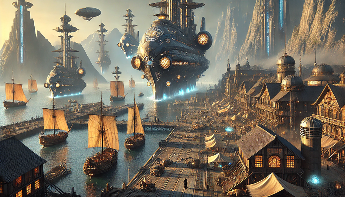 Thal’Zereth, Heaerea — A ceremonial port in the eastern Nevrish Kingdoms where Leviathans often make landfall. Towering cliffs and cascading light reflect the Nevrish ideal of order, tradition, and silent strength. Guild vessels are welcomed with cautious reverence, as their presence often signals more than trade.